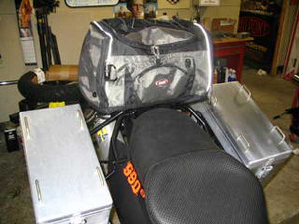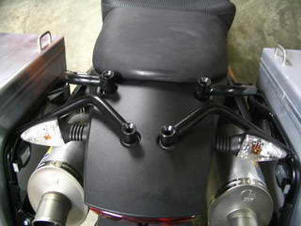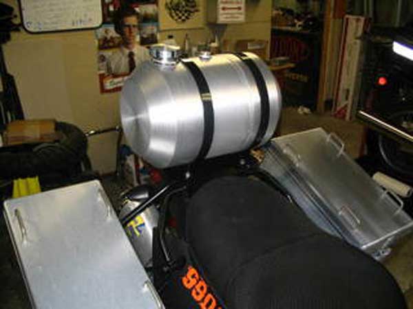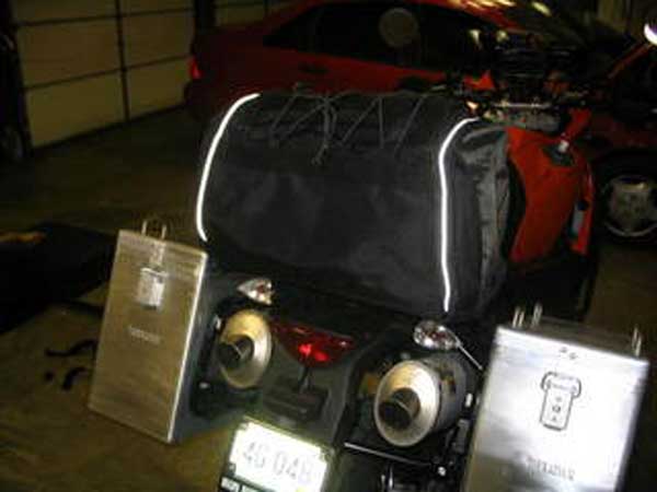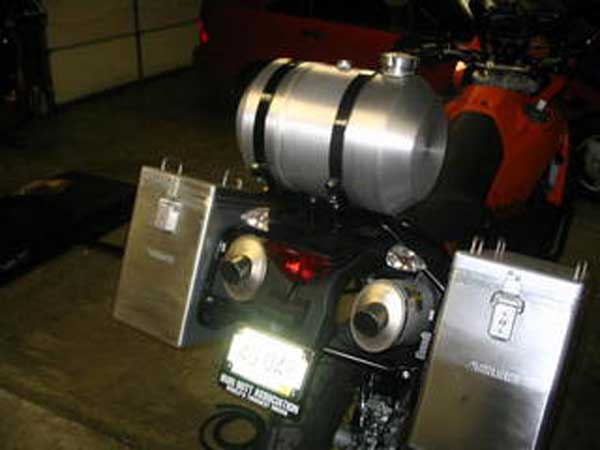 Just about done with my aux. tank install. This will allow me to carry 4.5 gallons more fuel for those long runs between fuel stops. The tank was bought from Tour Tank along with the quick connect. I removed the stock rear rack first. I made a plate to bolt to the rear of my bike, then bolted the fuel cell to it. The spacers are .875 long and made of alum. I did have to buy some longer bolts.. 8mmx80, and 8mmx90 IIRC. I used the same kind of tank on my FJR, and it was great. Heres some pic's..