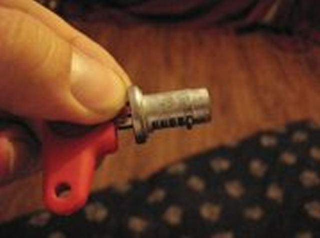 Once the tab is pushed back give the lock barrel a push with your free hand (not pictured as I am holding the camera) and then withdraw the barrel complete