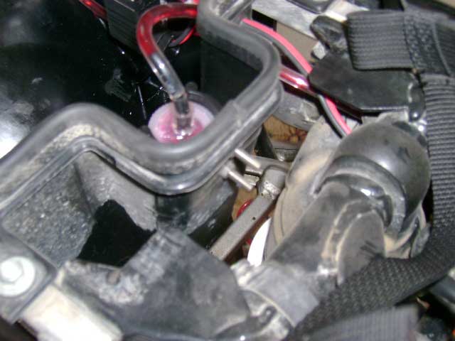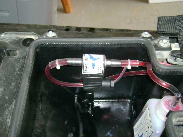 Here's the slick little pump mounted inside the storage bin underneath the seat. I used industrial strength Velcro on the back side of the pump to avoid glue or screws. NOTE: The oil residue in the bottom of the storage bin is not from a leaky pump but rather from leaving the pump laying over night before installing the downstream supply line.