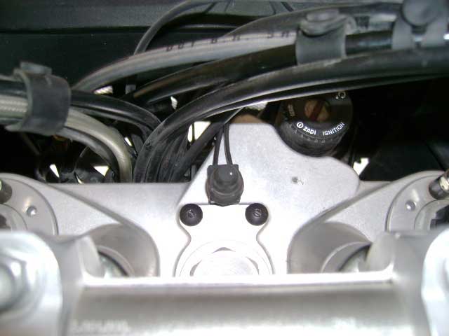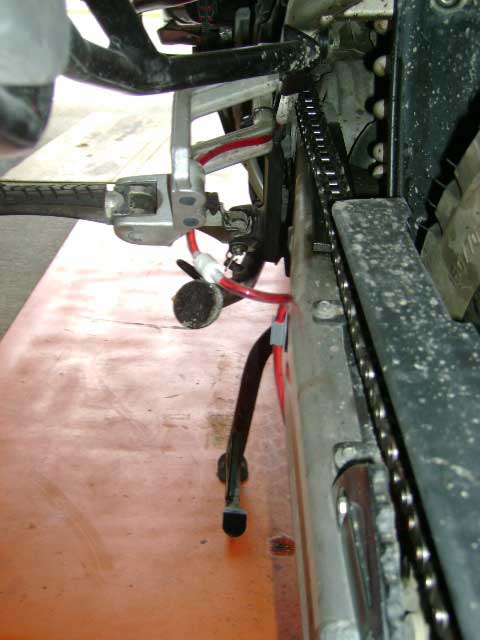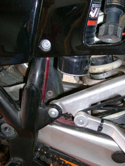 Here you can see two holes I drilled for the pump's power wires and the oil tube which heads down to the chain. The power wires run forward on the pilot's right side of the trellis frame down to the battery and up to the top of the triple clamp (more on that a few photos further south).