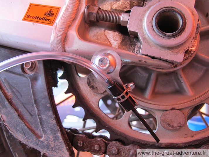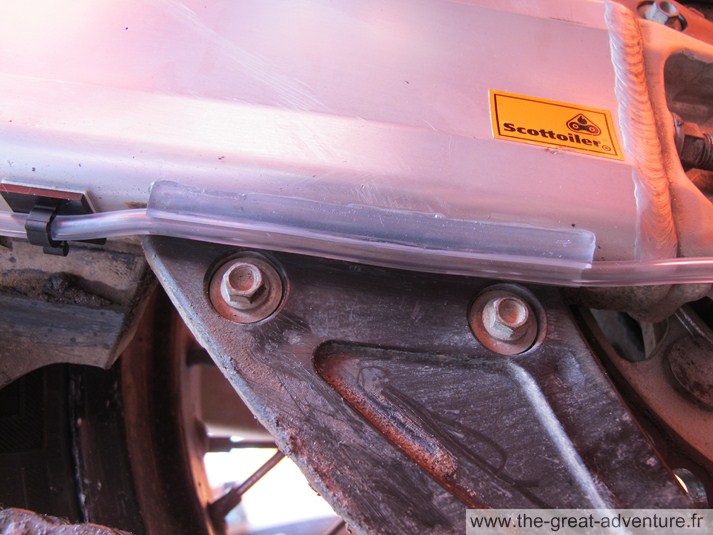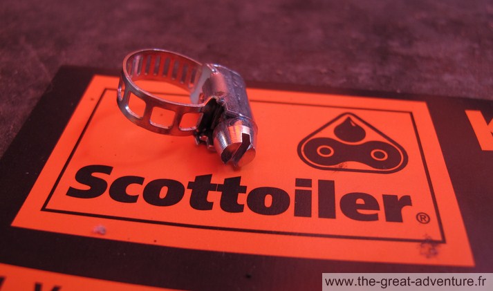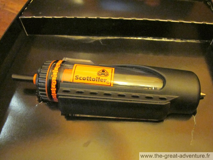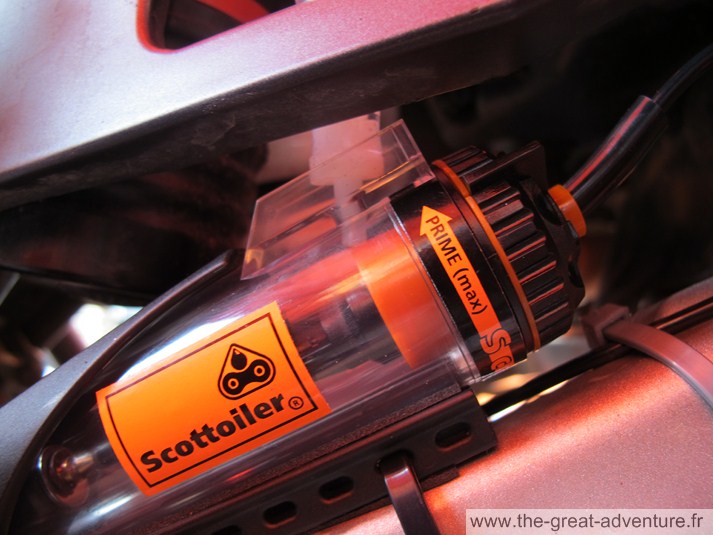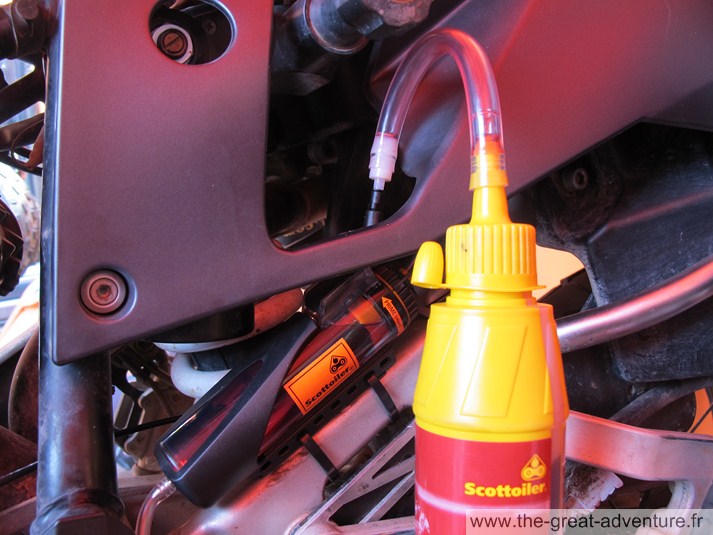 To make it short a Scottoiler vSystem is a system that drops some oil on the chain at regular intervals. It's composed of a reservoir of oil and two tubings, one from the engine to the reservoir, the second from the bottom of the reservoir to the chain. The first one is connected on the intake of the engine, where there is a vacuum created when the engine is running. This vacuum sucks on a rubber diaphragm inside the Scottoiler reservoir, lifting it upwards, and this in turn lifts an internal flow control needle into the open position to allow oil to flow by gravity out of the reservoir and down to the chain by the second clear delivery tubing from the bottom of the reservoir. In short, the whole system simply relies on the reservoir being higher than where the oil is being delivered (onto your sprocket) and the delivery tube being full of oil. Simple. And most of the time a simple system is a reliable system, I like it! You can find more informations on how it works and on technical specs on the Scottoiler website.