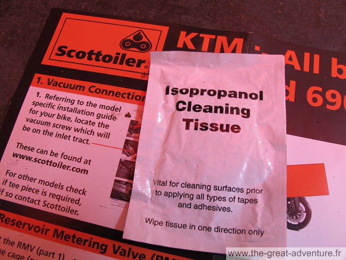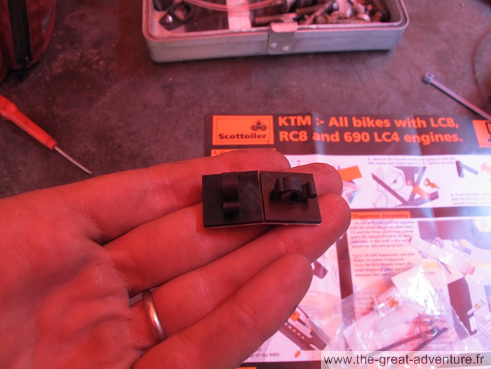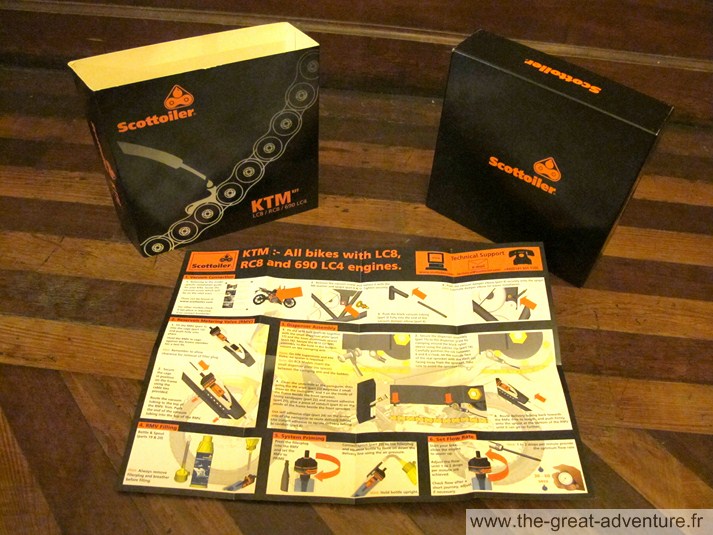 The installation is very easy because it's a special KTM LC8 kit. The installation manual is especially written for the LC8. Scottoiler also writes specific manuals for many others brands and models, here too you can visit the Scottoiler website.