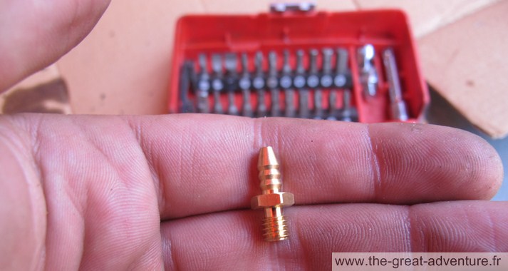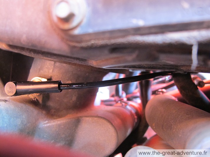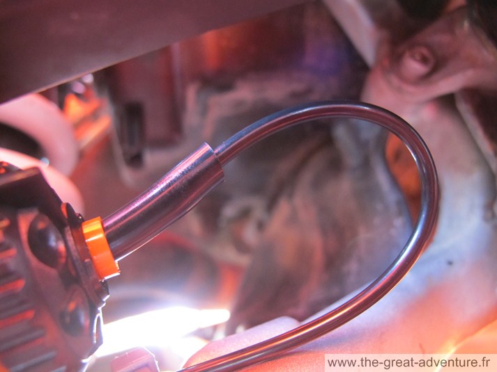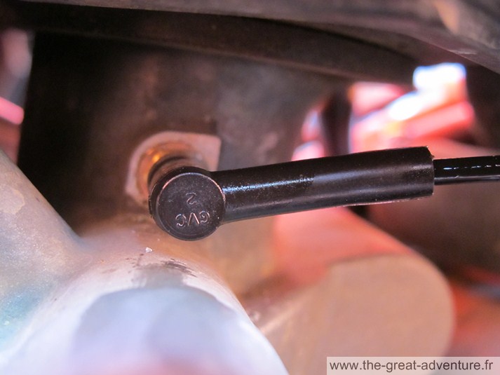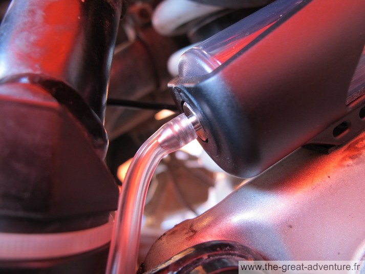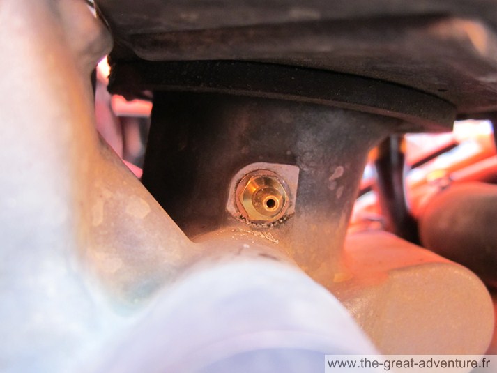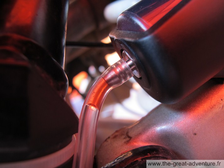 But don't worry, to install the Scottoiler you only need to strip off the right side of the bike, the easiest side! With the right tank off you can access to a screw on the intake of the rear cylinder, here :