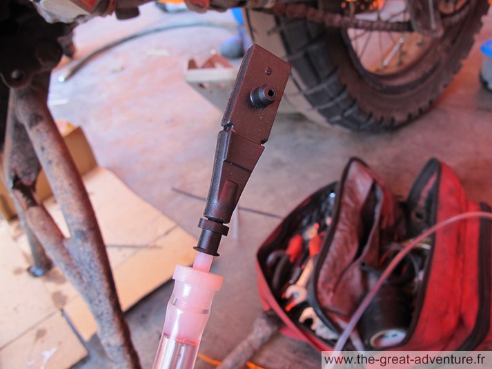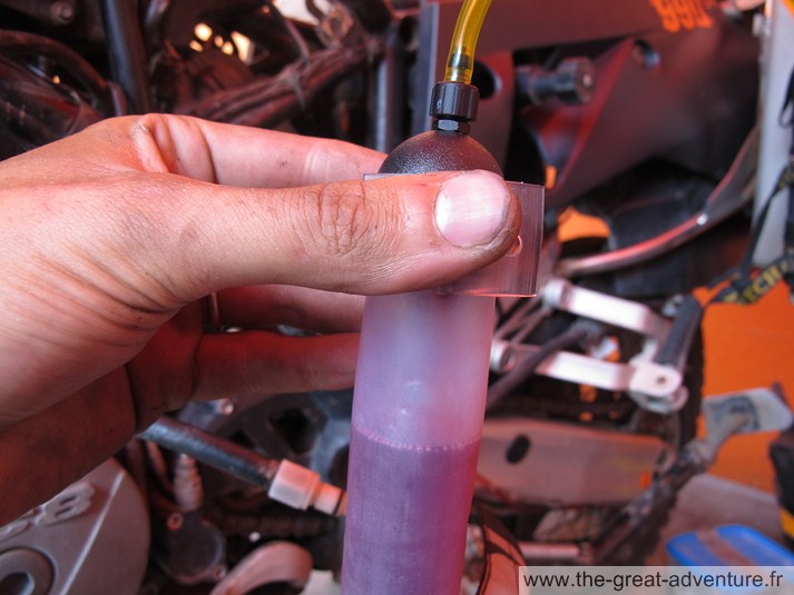 Squeeze to get all the air out and force the oil down the tubing. Then plug it to the main reservoir using the fillerplug :