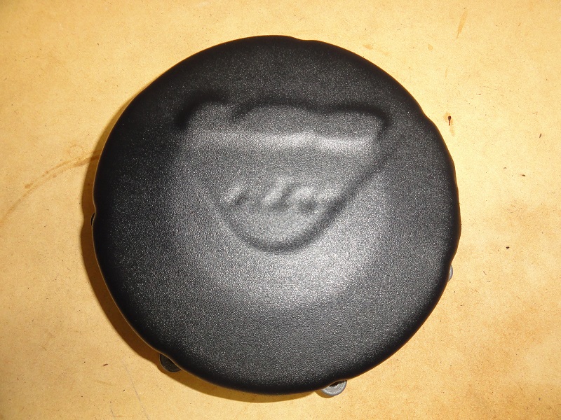 So, if you look closely you'll see that the clutch cover is not flat, it has a contour. I had to use a hammer, crescent wrench, and my bench vise to form the piece. This was the most frustrating part of the job and I almost gave up once, but eventually I figured out a technique to get it shape the way I wanted. This is the piece after some sanding to rough up the surface just before cleaning it and paint. I wasn't too bent on making it pretty since I knew it was just going to get covered in paint anyways.