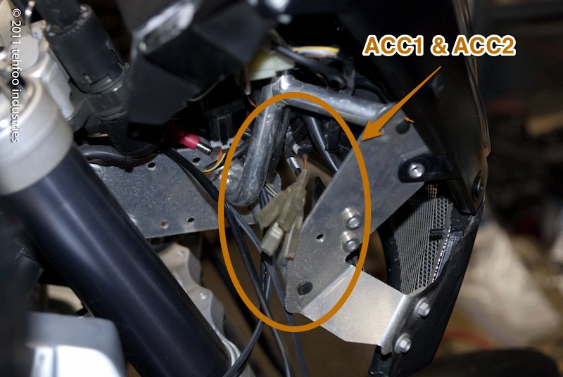 Here are the ACC1 (unswitched) and ACC2 (switched) wires in the KTM harness. This is the right side of the headlight shroud, they were tucked up just behind the subframe. Brown is the ground wire.