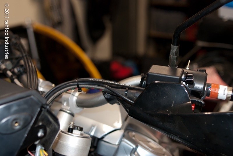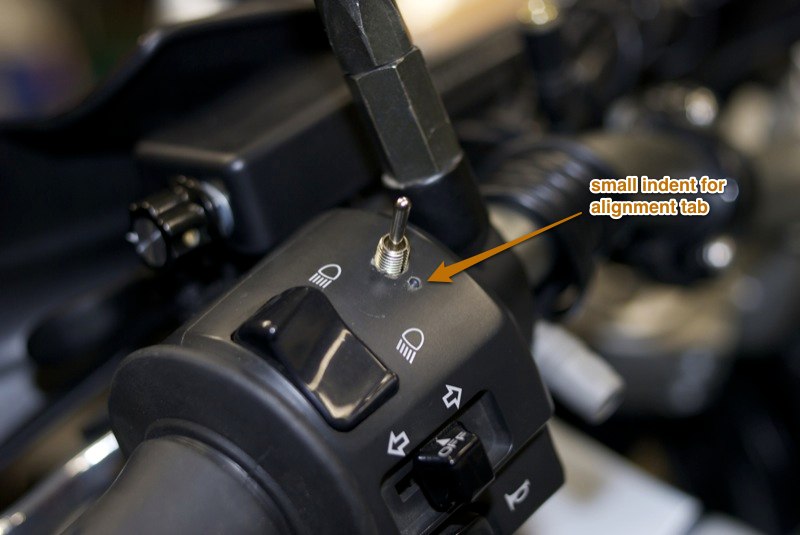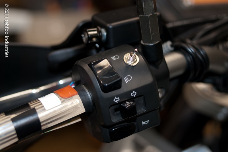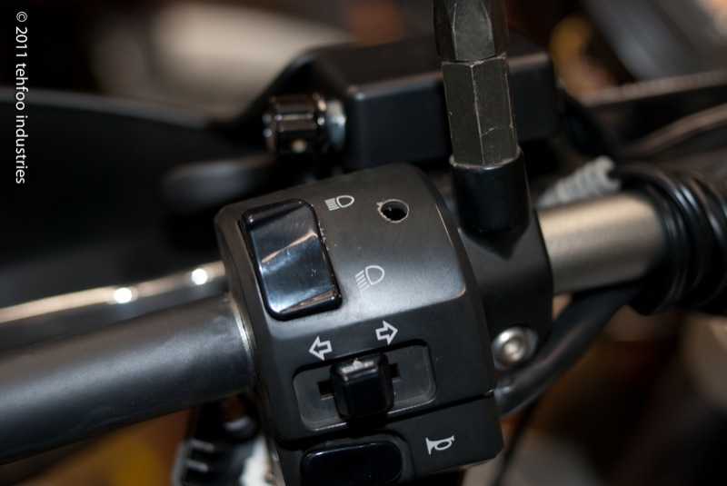I decided my install point should be the left side handlebar switch housing. There's enough room internally to *barely* fit the wires. The switches I found have really short terminal posts, which helps the wires clear the bar once installed. This install requires drilling a small hole in the faceplate. I don't remember the bit size, basically as small as possible but still fitting the switch. In this photo you can also notice the shrink wrap on the clutch side bar.