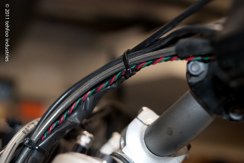 Once that was drilled, I was fully committed, so it was time to wire up the switch. I wanted to use 3 conductor, 22 gauge wire, bundled in black housing. However, I also didn't want to order a 500ft roll, or wait 2 weeks for it arrive. I farted about with some landscaping wire and various bundled data cables, then decided to just braid some 22 gauge wire and be done with it. I had done the same with my Ducati, using 3 black wires to keep it discrete. This time I opted for colored wires. The color choice was based on wire I have on hand, but since the colors don't make any sense on the Symtec kit, either, I didn't feel too bad.