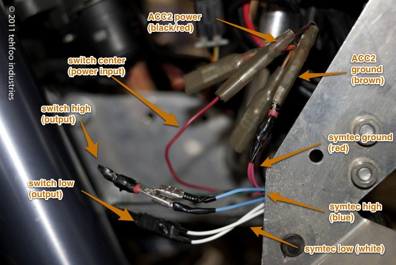 It was pretty easy to follow everything else down to the steering head, and out the right side to where the ACC2 wires are. I decided to wire in to ACC2 (switched), since I don't see much need in having them on when the bike is off. When I was done routing, I sanity checked the continuity through the switch circuit. This helped me remember which color I had wired to high (up) and low (down) on the switch. It's not intuitive on the actual switch, when you set the toggle one way, current flows in through the center and out through the opposite post.