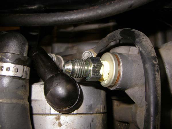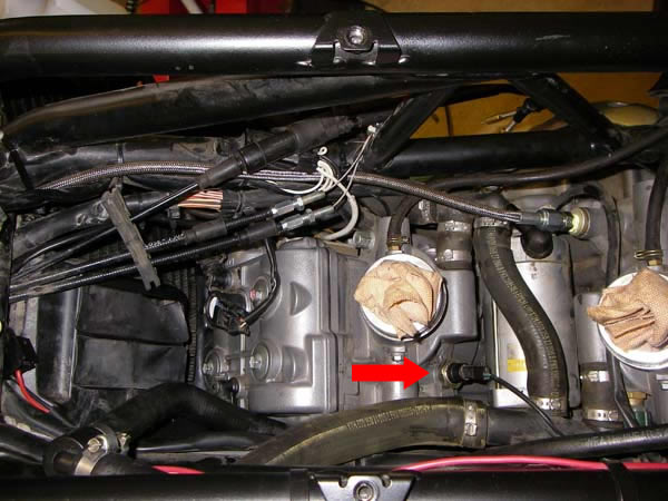 I routed the 36" long AN-3 (3/16" I.D.) stainless steel braided high pressure hose along the right side of the frame. This tap in location also allows me to easily keep the OEM "idiot light" (red arrow) for those times when I am distracted and not watching the gauge. Some racers attach a large, bright brake light to the oil pressure switch and mount it in their line of sight, for just those critical situations.