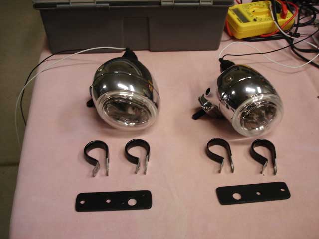 Just finished installing a set of PIAA 912's on the crash bars. Made my own mounts using (4) 1" insulated clamps (NAPA ~$4) and 1"x1/8" steel flat bar (Home Depot ~$3 for 3'). I drilled the light hole off-center so I could fit a 17 mm socket on the nut without interference from the crash bar, then painted them black: