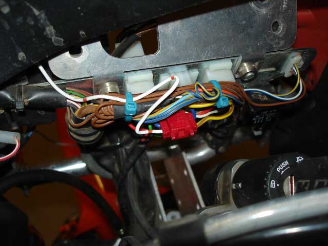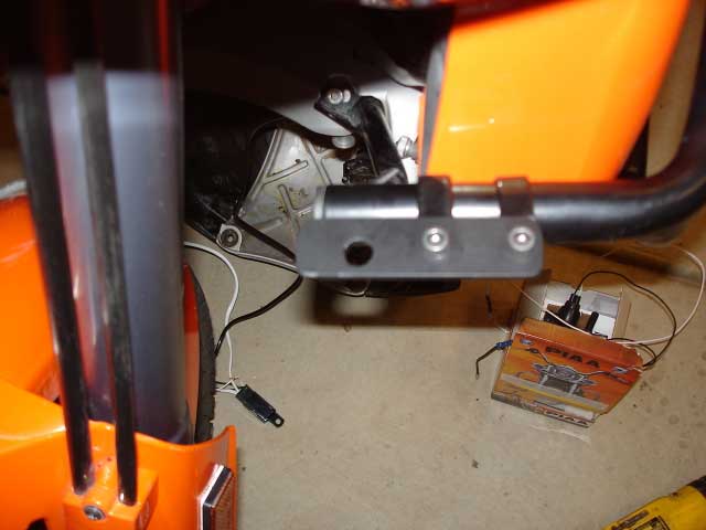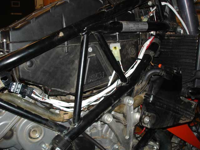 Mounted the relay and in-line fuse between the frame and air cleaner box. If you choose this location, make sure the wiring does not interfere with the fuel tank---it rides on the frame: