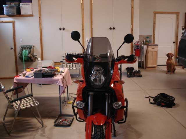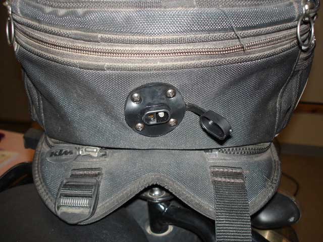 Also took the opportunity to relocate the battery tender connection from the oil fill location to a location near the handlebar clamp. Also installed a Power-Let fitting into the tank bag (powerlet.com). This will be an easier location to reach when charging the battery: