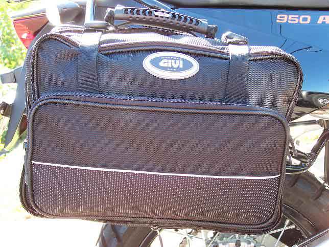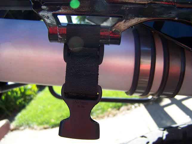 The GIVI T421 Bags as I've used have 2 D-Rings sewn in the bottom and lower sides. These are very strong from GIVI and used as securing points for the Buckle system. You will run 1 Buckle from side to side D-ring and 2 vertical Buckles, 1 attached to the frame and the other side to the bottom D-ring on the bag. Make the male Buckles adjustable downward and to the rear (away from the exhaust). The top of the bag is secured by using the factory Buckles across the front of the bag (2). Loop the Buckles around the top of the luggage frame and then down the front of the bag to the other half of the Buckle, then tighten with the pull straps.