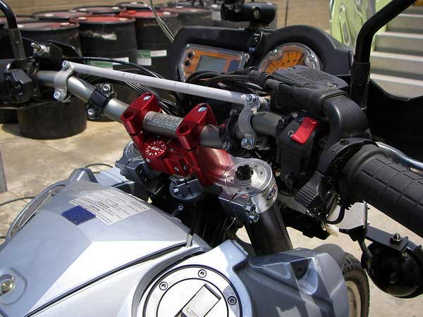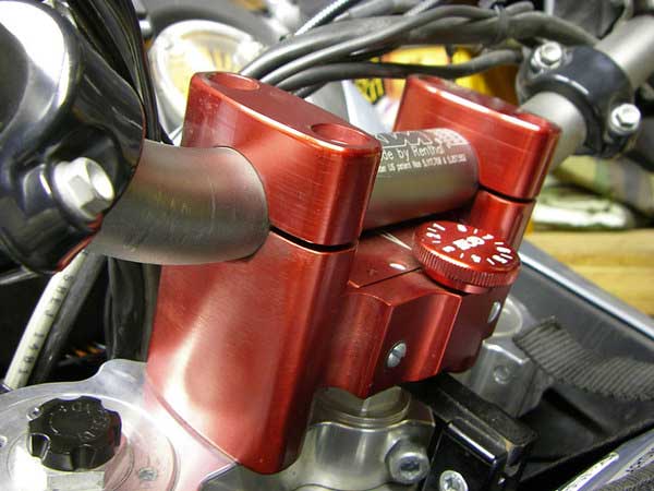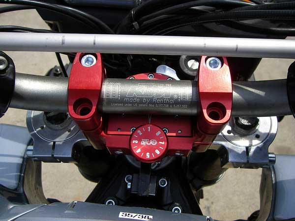 This is a high quality piece of equipment that adds an extra measure of stability and safety to the Big KTM 950. It has both high and low speed damping circuits built-in and controlled with a single large knob. This comes in handy when the action gets hectic. Even at low settings, the high speed circuit dampens sharp jolts very effectively. Dual action damping is necessary because bumps come from both directions (jolting the bars away from center as well as toward center. The effects are most noticable in the dirt, especially at high speed in ruts and rocky terrain. The result is a much more relaxed ride and a noticable decrease in wear and tear on the upper body. Arm pump is back to a managable level. The rougher the course, the more noticeable the improvement.