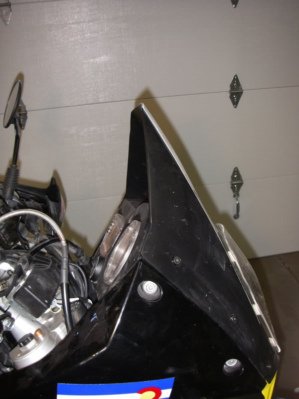 Once I finally found a style i liked I used the cardboard template to trace a shape on the OEM windscreen. I then used a fine cut blade on a Jig saw and cut down the screen. I then cleaned up the edges w/ a razor blade and sanded them down with various grits of paper. My stock windscreen was already scratched up so I decided to paint the whole thing. To do so i sanded the whole windscreen w/ some fine paper to rough it up and promote paint adhesion. After that I used Krylon Fusion spray paint (primer less plastic paint) and painted both sides black. I later went back and added the white numberplate to make it look a bit racier. I think the key thing is that after cutting about 3" off the top, I trimmed the sides in a bit. If you look closely you can see where I cut in about 1" following the line of the bodywork, then went up almost vertical.