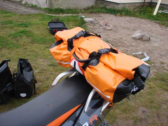 My normal set up. 2.5 L of extra juice in the tail Touratech bag. I can fit 2 2.5L jerry cans of fuel in this TT bag, its expandable.