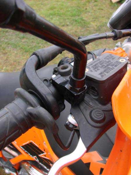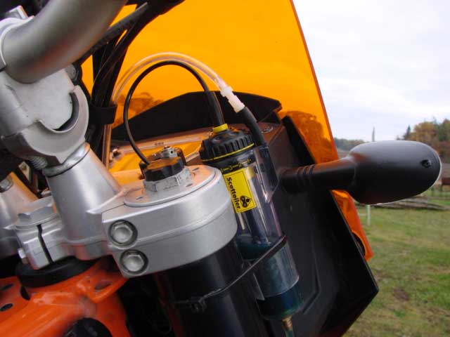 The mirrors. I found these smaller mirrors and extra mirror clamps @ Louis.de. Put some teflon tape under it to prevent scraping handlebar while having possibility to turn/rotate when falling.