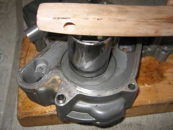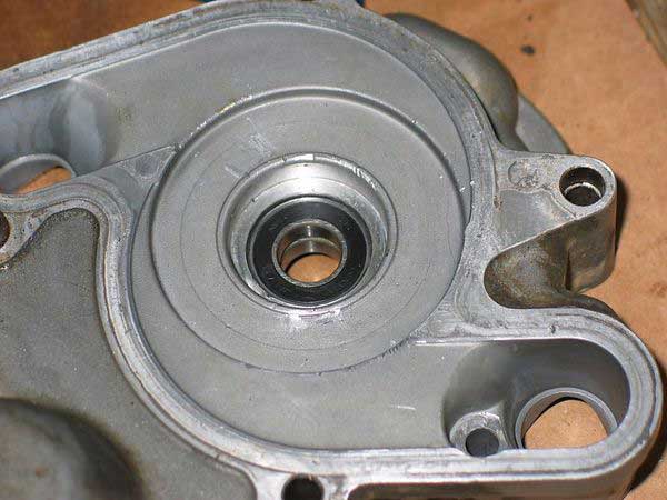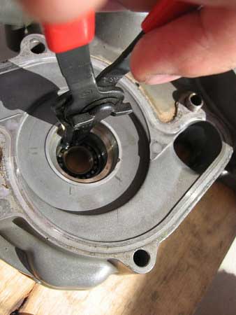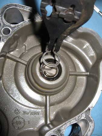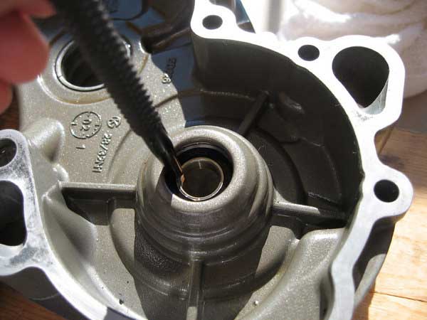 Then, install the outer bearing with the seal facing up or outwards from the engine in the same manner as you installed the first. Make sure it is fully up to the circlip.