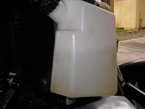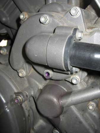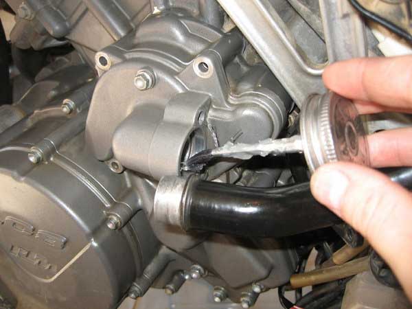 Fill the coolant system through the radiator cap until the radiator is full. This could take some time as the coolant has to slowly feed its way into the engine, so be patient. Once the radiator is full, remove the upper bleed screw in the water pump cover and bleed all the air out of the pump until fluid flows. Put the screw back and tighten.