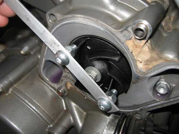 Unscrew the impeller bolt without applying a turning force through the pump drive mechanism. Apply the same force on the tool you have just made but in the opposing direction to the wrench.