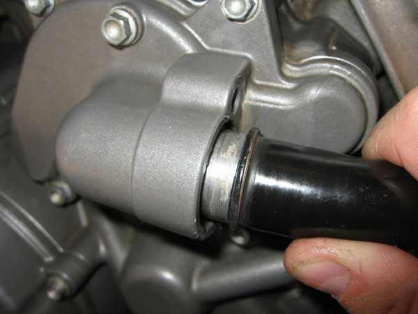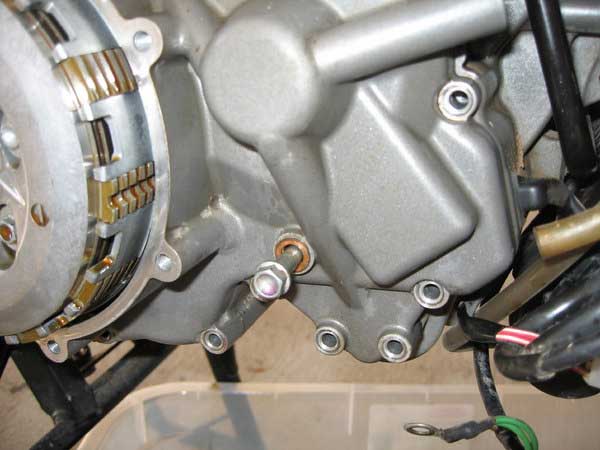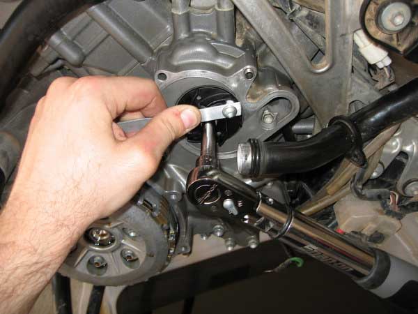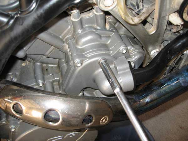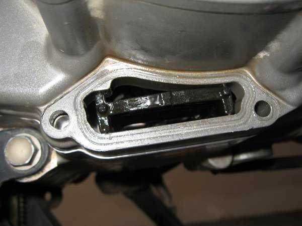Remove the lower screen cover just below the clutch outer cover and remove the screen from inside. Note: You do not have to drain the oil to do this, the sump should only have about a cup full of oil in it, and the remainder is in the tank. Just remember to check oil level once the job is complete. It is probably a good idea to change the oil and filters at the same time as a water pump rebuild since a lot of the bike is already stripped down so you have access to all areas.
