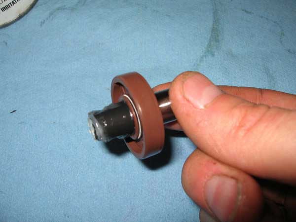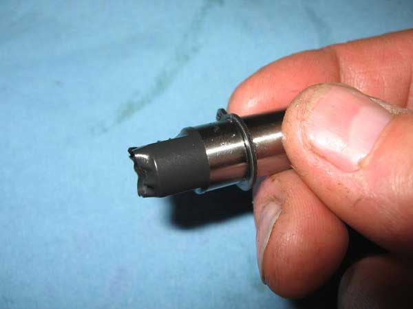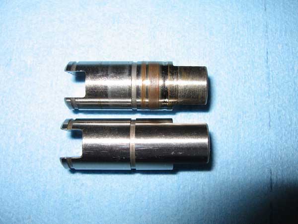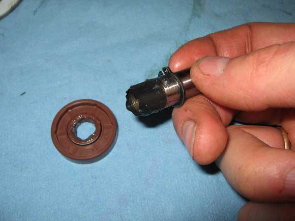 Compare new and old water pump shafts. This one was replaced 12,000 miles ago and as you can see it has a considerable groove worn into it from the pressurized water side seal (far right).