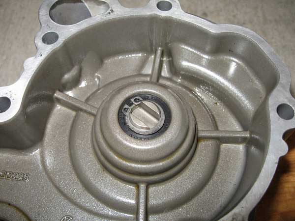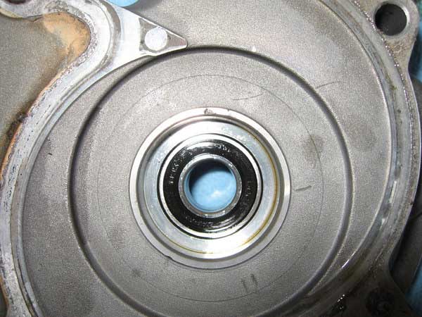 Take note that the housing holds two identical bearings and each only have seals on one side. The inner most bearing (first image) has the seal facing into the engine, the outer most bearing (second image) has the seal facing outwards. The bearing both exit through the outer face of the cover. In-between the bearings there is a circlip so you have to remove the first bearing and then the circlip before you remove the second bearing. Do not try to remove them both together. All three circlips within the pump shaft system are there to locate the axial position of the water pump shaft and prevent it from drifting side to side under operation.