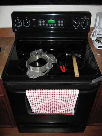 Now comes the fun part. It is essential that you wait for wife or girlfriend to be out shopping or something for this part of the operation! Preheat the oven to around 350F. Once up to temperature plunk the clutch cover in the oven for approximately 15 minutes so it is up to 350F. At the same time place the two new bearings in the freezer for 15 minutes.