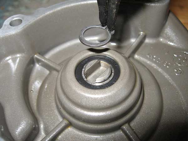 Flip the cover over and install the remaining small circlip on the inner edge of the pump shaft.