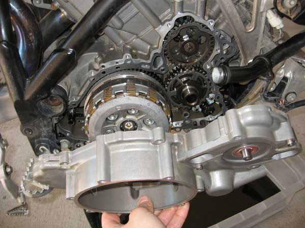 Carefully slide the inner clutch cover from the engine making sure not to loose or drop the two locating dowels in the engine. In the pictures they stay inserted in the engine side. To remove the cover fully you will need to rotate it anticlockwise as you pull it further from the engine.