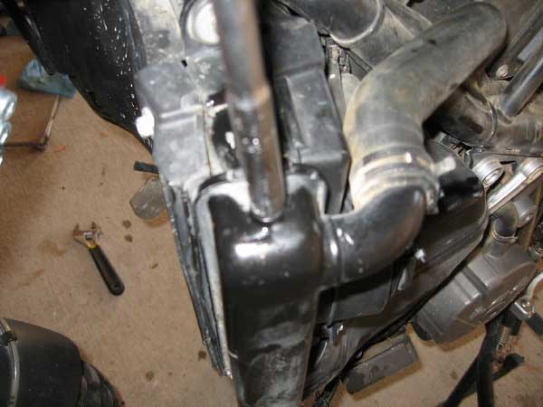 Lean the bike side to side to remove as much coolant as possible form the engine and prevent it from dripping all over you while you work on the bike.