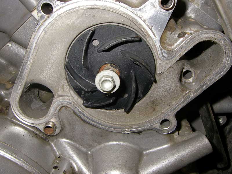 Once the pump cover is removed, the plastic impeller can be inspected for damage. Look for any contact between vanes and the inside of the pump cover. A few early bikes had problems with dislodged or missing circlips that allowed the impeller to move in and out of the bearings. The result was plastic bits showing up in the coolant recovery tank, and eventually, overheating. This engine does not show signs of contact. The circlips were all present and functional.