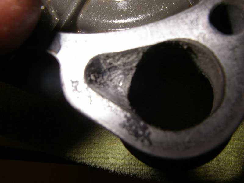 This is an image of one of the areas in the inner cover water passages that collects casting sand. There is a small amount visible here. I have seen much worse. Clean all of these areas and the rest of the pump chamber thoroughly. It should be "squeaky" clean, if you expect long life out of your new seal and shaft.
