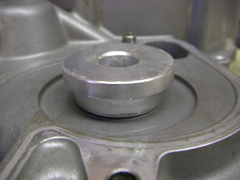 Here's how the seal installation tool works. Lube the seal and tool with lots of your favorite seal lube. No matter what method of protection you use, it's VERY important that the seal is not damaged by the very sharp edges of the new shaft. I've seen several seal failures as a result of folks not getting this step right. I also spray some silicone mold release agent (available at most good hardware stores) on the edges of the seal and the cover where they mate. This allows the seal to be removed easily next time (Especially helpful if you're doing a seal only replacement).