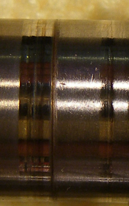 Here's a close-up of the groove area from the photo above. The groove on the left is considerably deeper than the right. You can also see a wide band of wear just to the left of the left side groove. I suspect that is caused by leftover casting sand in the coolant passages that migrated to the seal area. This engine exhibited NO signs of coolant leaking into the oil at the time of this pump overhaul at 19,733 miles. I suspect it wouldn't have gone many more miles before the seal gave out.