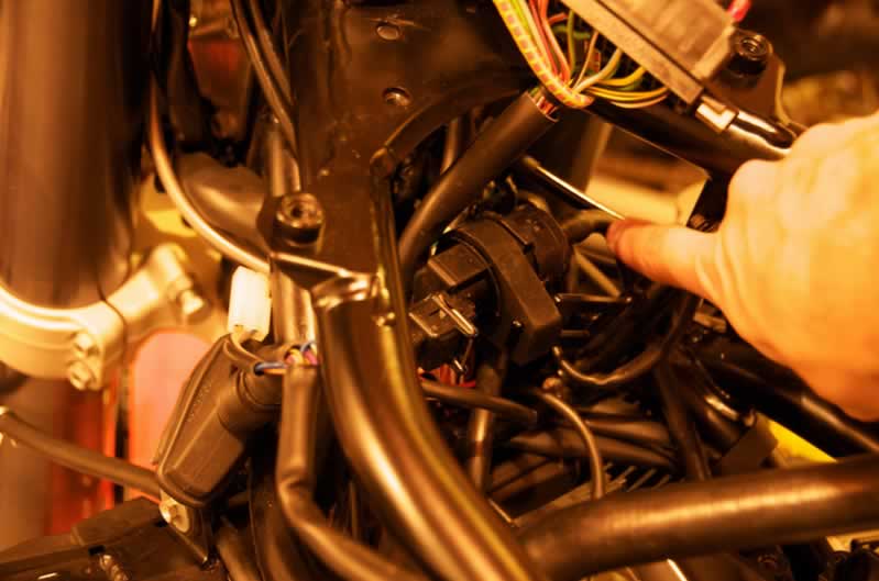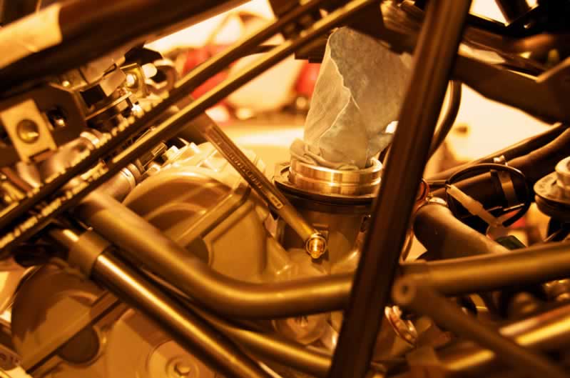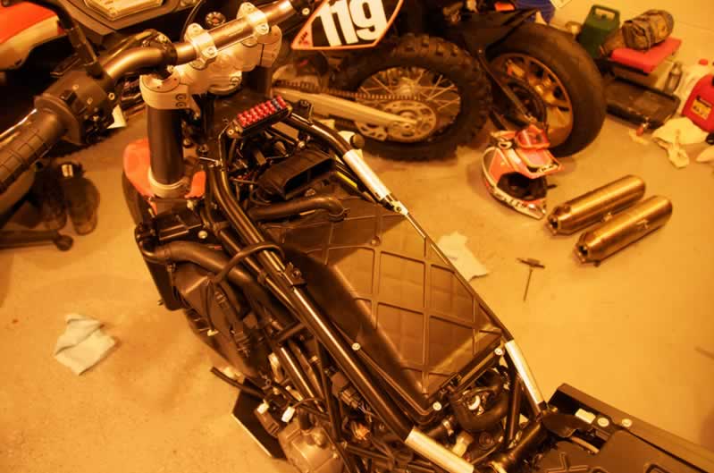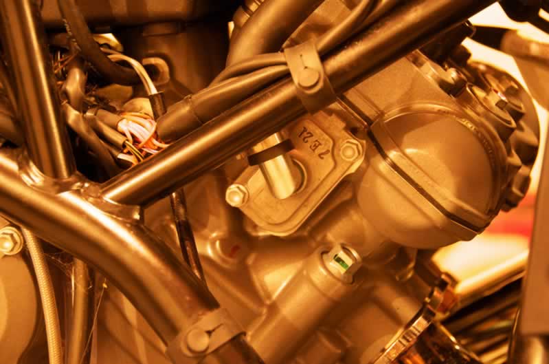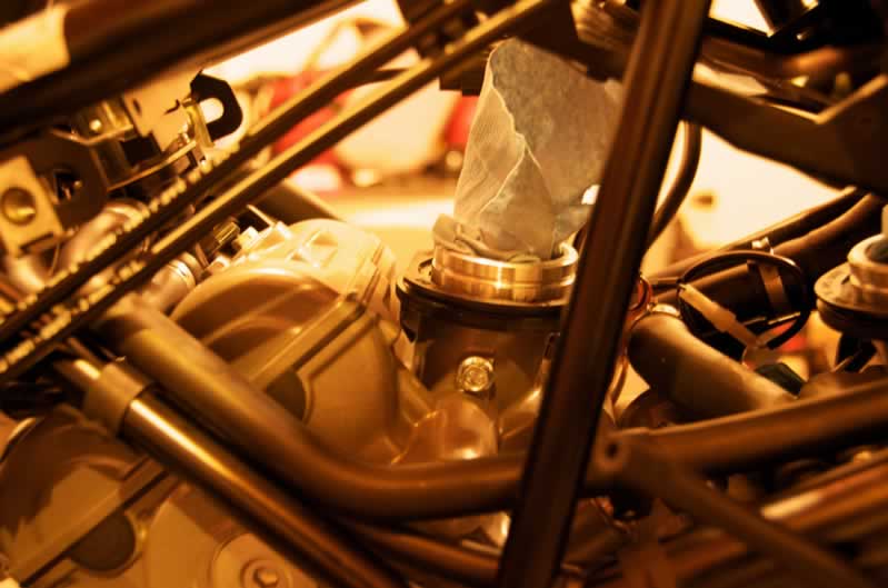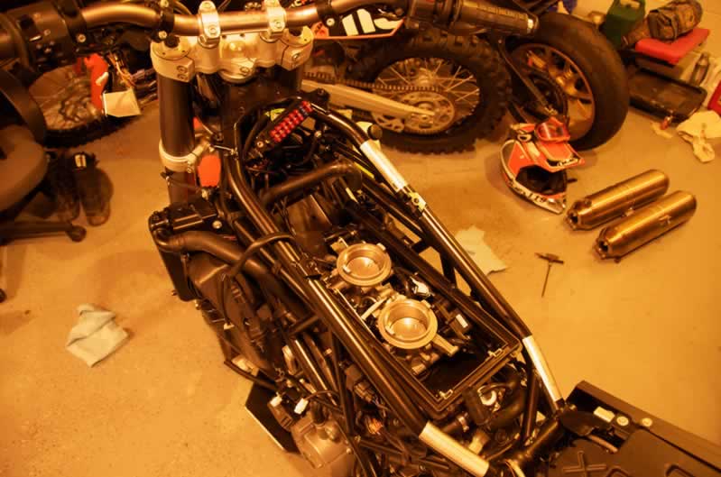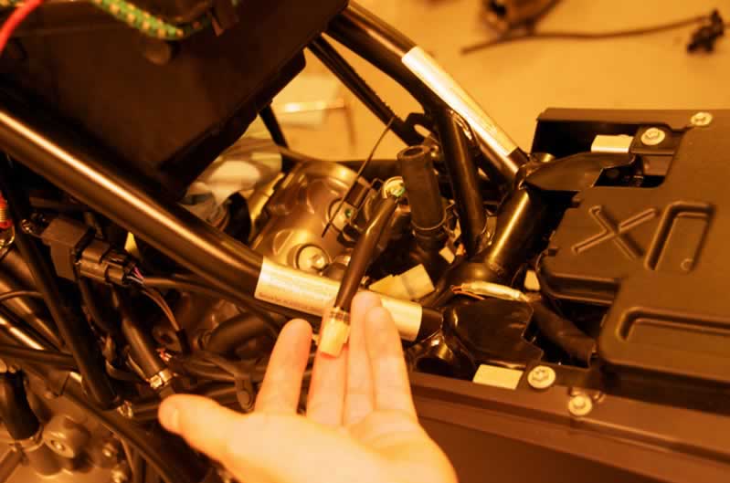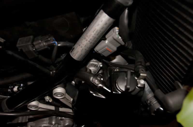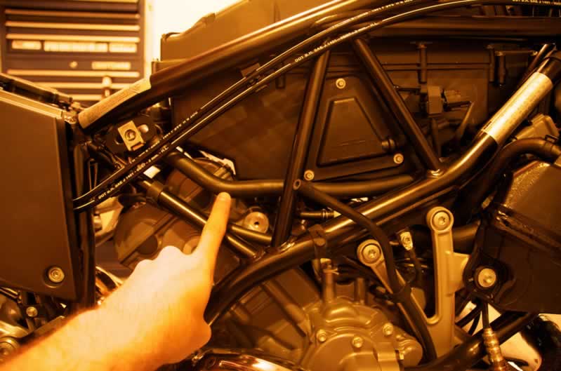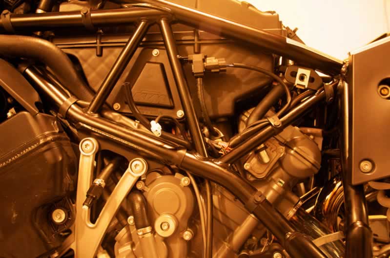 *Note: On the 950's the standard, as far as I know, is to remove the left side plugs and leave the right side to sync the carbs. I'm not too sure this will work as there are pressure sensors hooked to the rear cylinder, left side and front cylinder, right side that then run into the ECU. I'm guessing that if you unplug these you'll throw an error code. If you look in this picture it is the black connector to the right of the triangle shaped airbox plate that says "KTM".