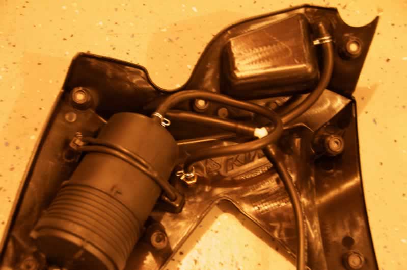 Let's start first with the canisterectomy. In the left upper fairing where the turn signal is if you look inside there should be a black container with a bunch of hoses inside. Taking the Torx wrench remove all the screws and separate the two pieces. When you're done you should have this.