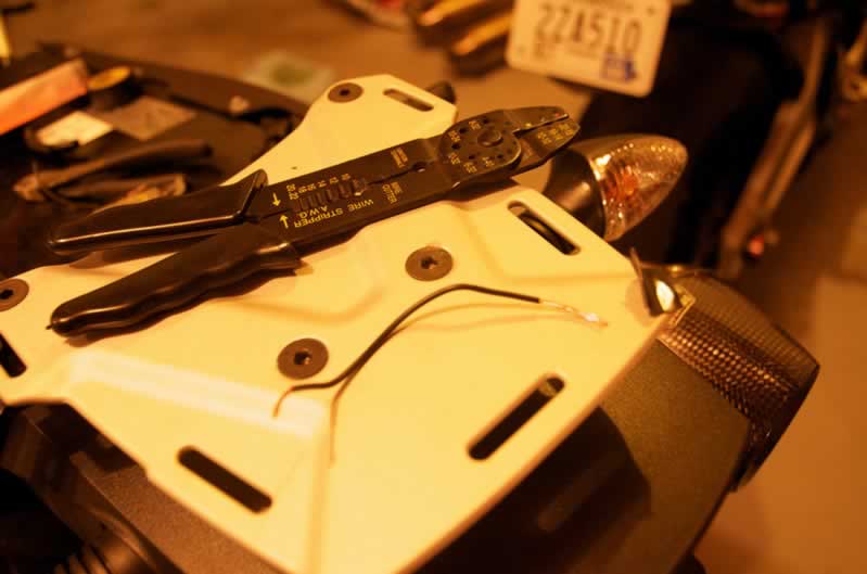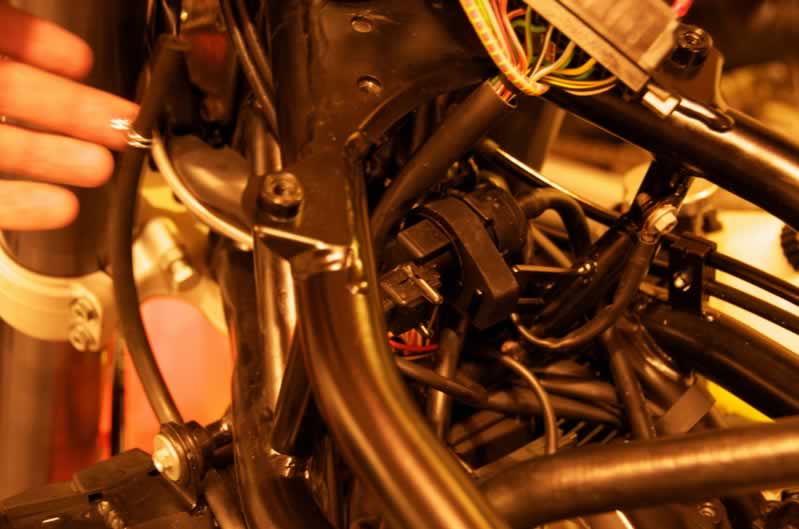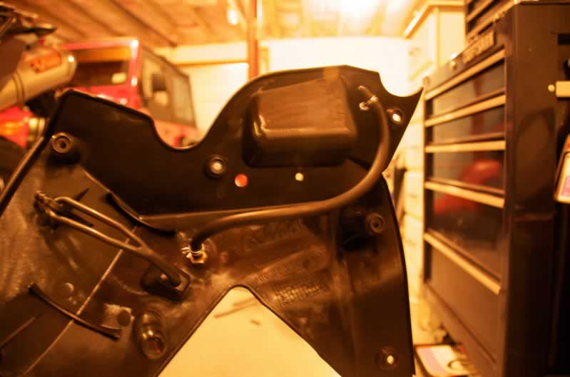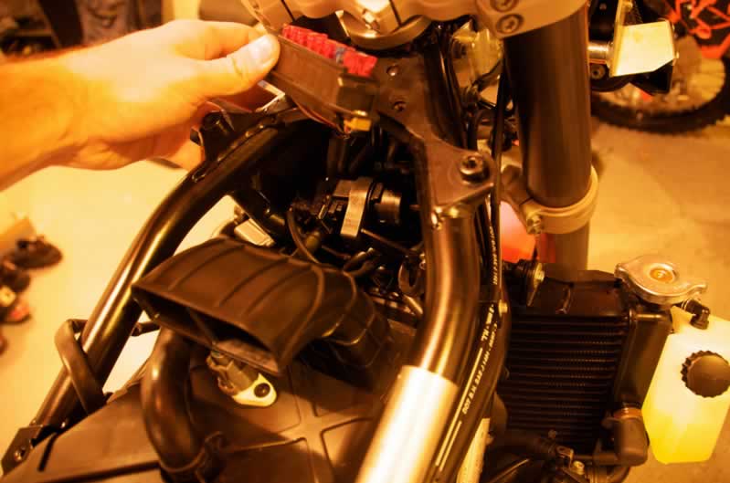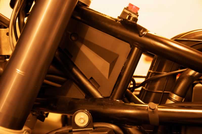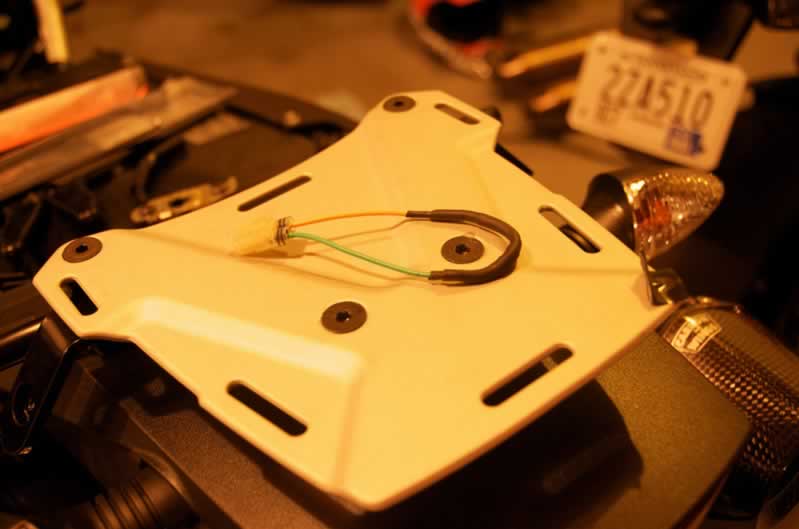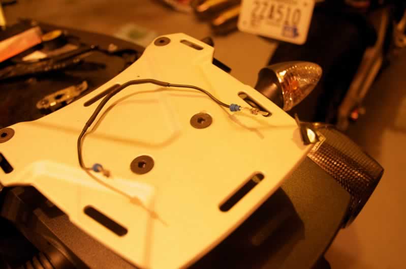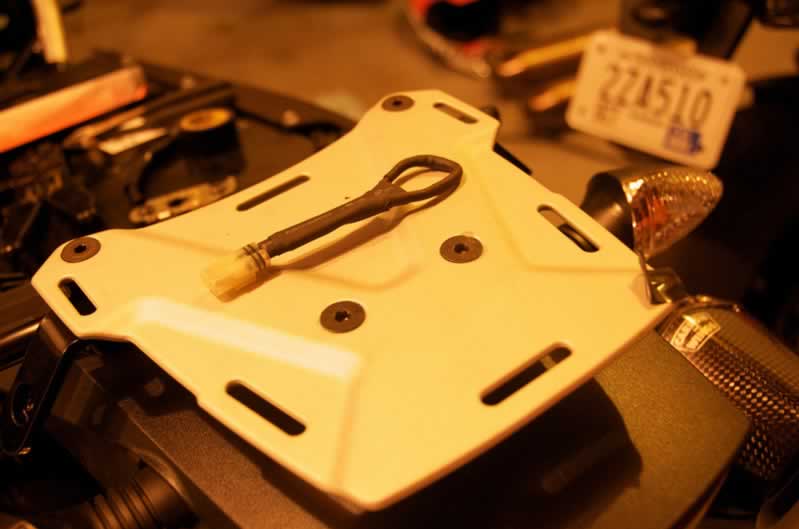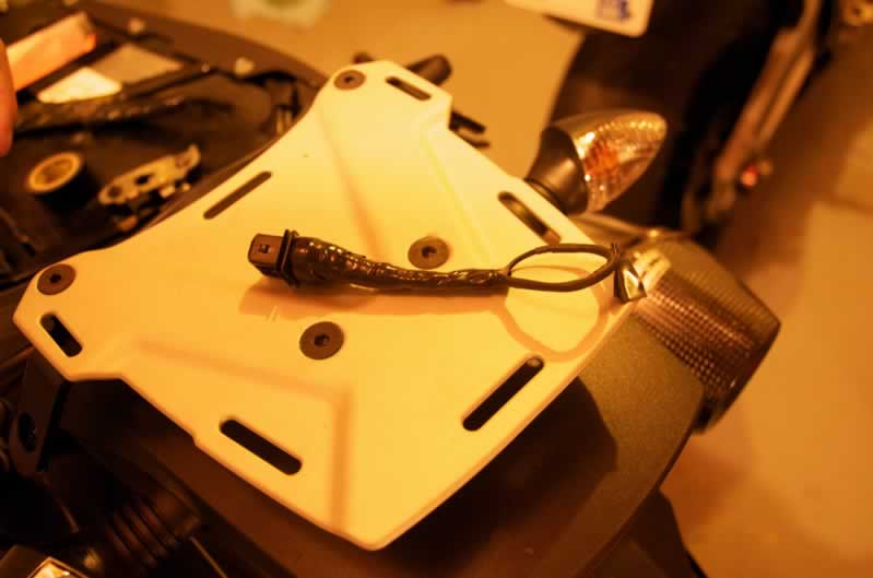 Plug this back into the stock plug and secure to the bike. I took a couple of small zip ties and attached it to the frame on the right side. There is a tiny strut where the VIN number sticker is. Basic idea is to get it somewhere out of the way.