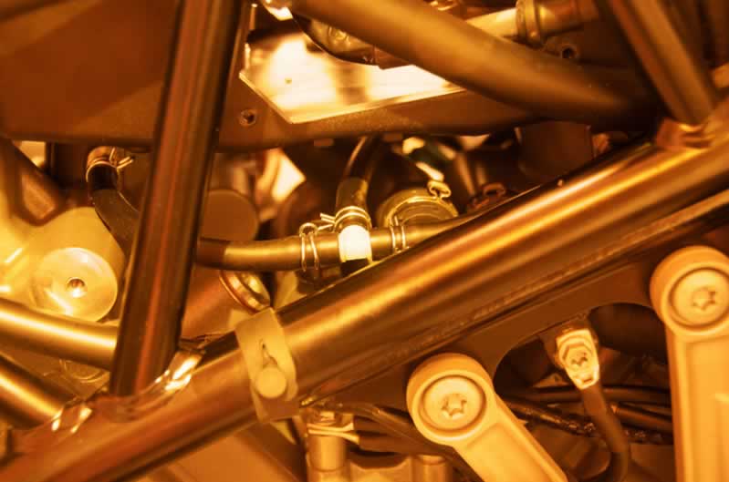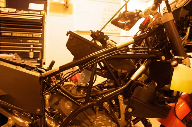 This is the right side of the bike. From the SAS pump this big hose runs to the front cylinder on the right side into a plate just like the rear cylinder.