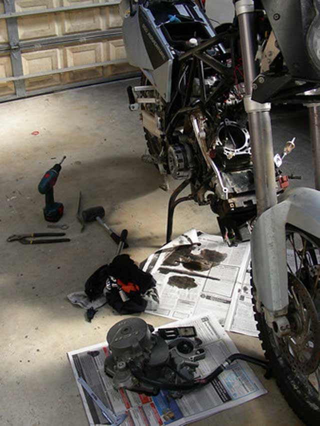 Recently I was just passing the bike on the way to get into the cage and whilst staring at the thing I was idly fiddling with the starter button, just pushing it enough to get the engine to turn over but not to fire. Yes it’s a stupid thing to do but… stupid is a stupid does. Suddenly it back fired and something didn’t sound right when it did.