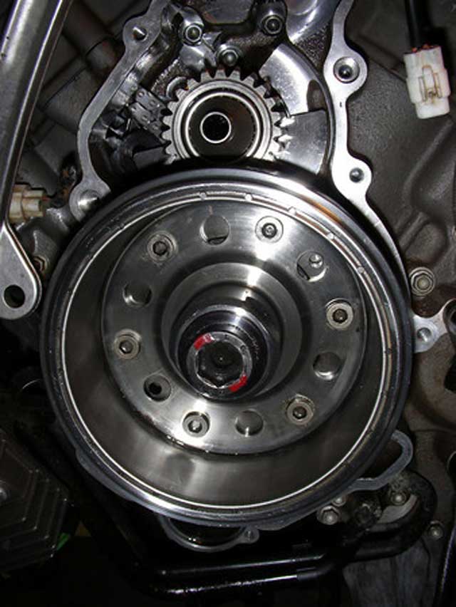 To get the cam chains out you have to take the balancer shaft out. That’s the shaft above the flywheel/rotor.