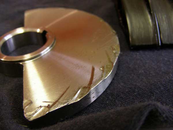 Once I got those off, I finally found what I believe is has been causing the clatter that I get from the engine. This is the left balancer; you can see the rear cylinder cam chain has bitten into it. The wear is all the way around the balancer – deeper where it picks up the chain and less as it turns.