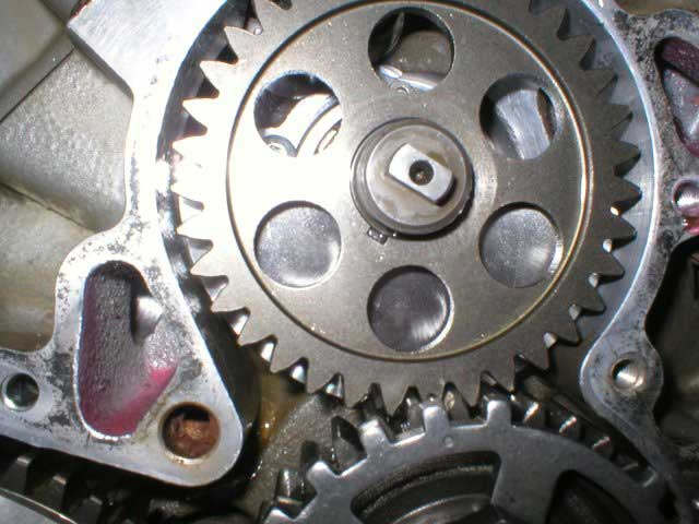 Remove the sprocket from the end of the balance shaft, followed by the balance weight. You can now see the camchain sprocket.