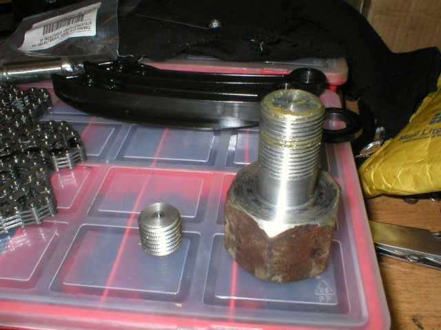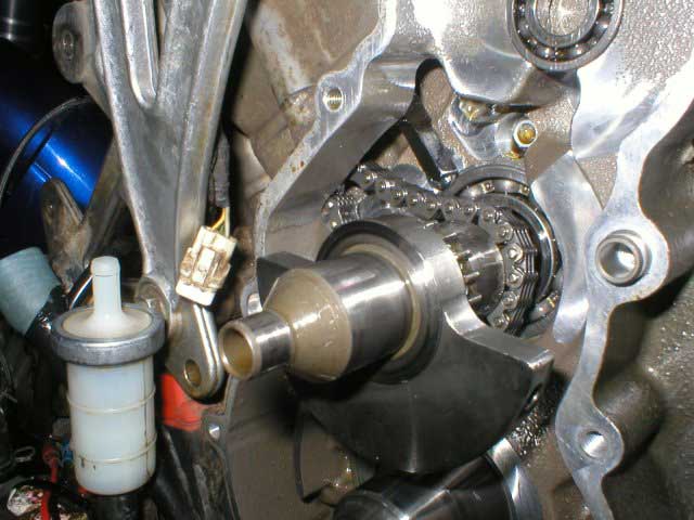 Pry the two Woodruff keys out of the balance shaft, and remove the small sprocket, and remove the camchain. You should now have a bare balance shaft, you don't need to remove anything else form this side of the engine. At the bottom of this photo you can see my home made engine locking bolt.