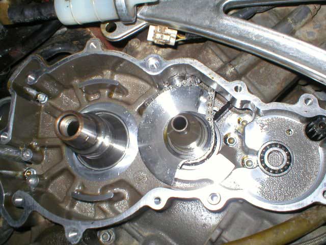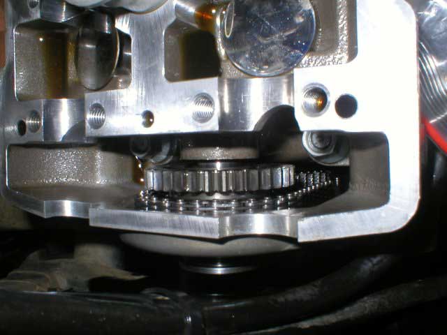 Notice a small dot on the gasket face of the crankcase in the bottom right of the picture - When the dot on the crankshaft sprocket lines up with this other dot, the front cylinder is at TDC.