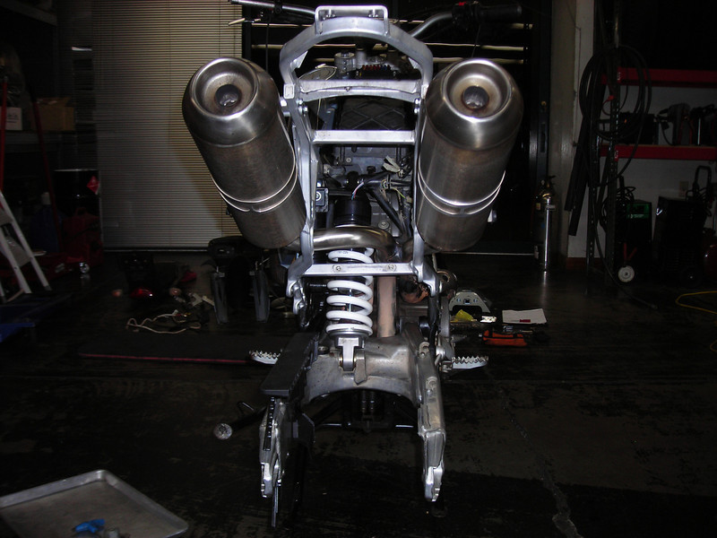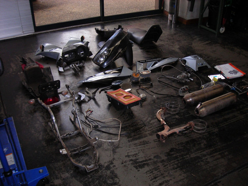 Sodablast to get 89,000 miles of road grime off the subframe and scotchbrite wheel on the buffer to get the pipes shiny again. Sort out missing hardware and gaskets, charge battery, and fire it up!