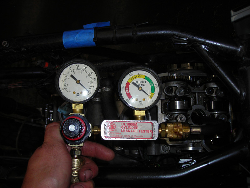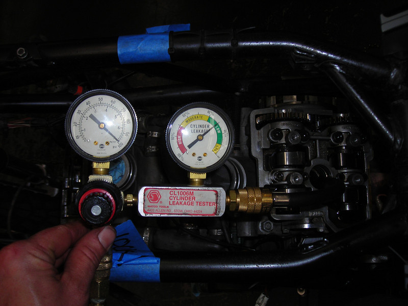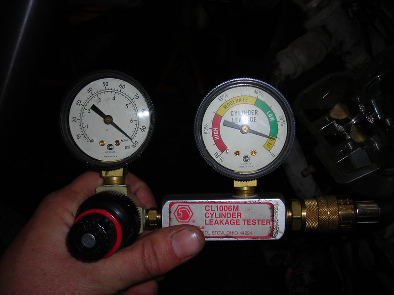 Woo hoo! For those of you that don't know what you're looking at, the gauge set shows inlet pressure on the left and percentage of leakdown on the right, or how how much of that 100 psi the cylinder is holding. 92% here, or 8% leakdown, which seems to me to be a GREAT number for a 90K motor cold. None of it leaking past the valves, just the rings.