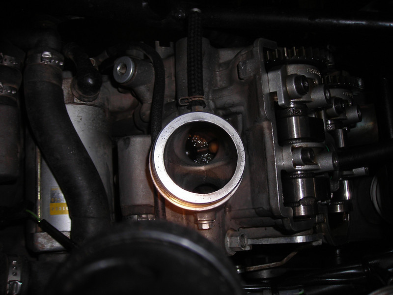 Ooh, not so good. And I can hear the air escaping past the intake valves. I shot some solvent down the port and it gushed right out. See the bubbles?