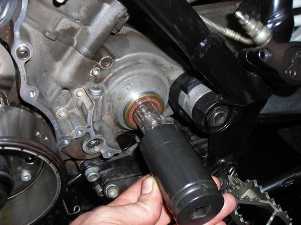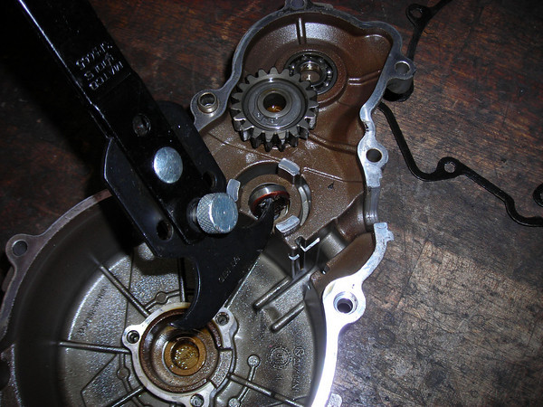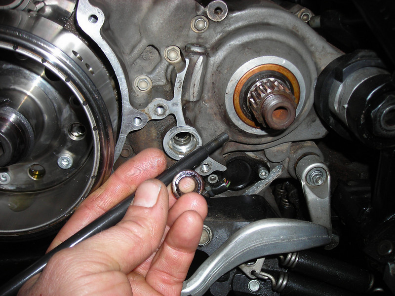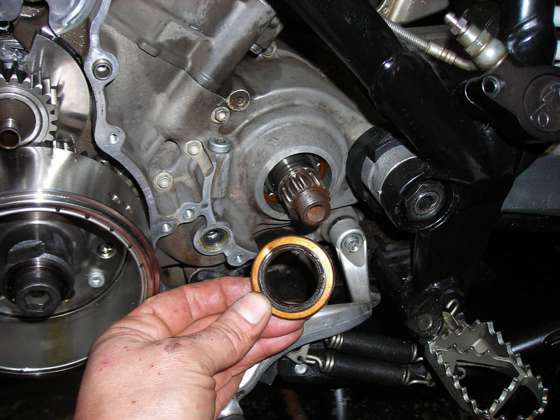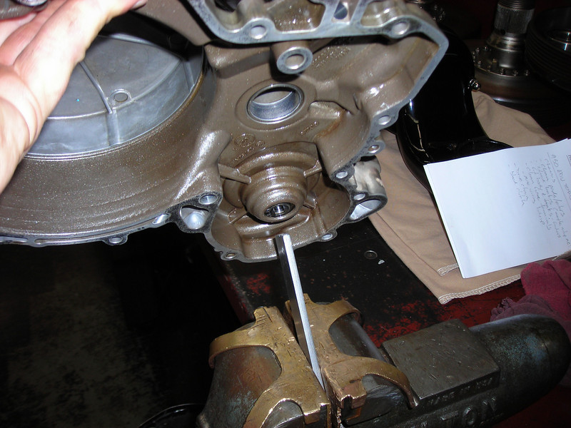 Next I changed the countershaft seal. There is no shoulder behind it so you can use a punch to push one side in until the opposite side pops out, then hook it and yank it out.